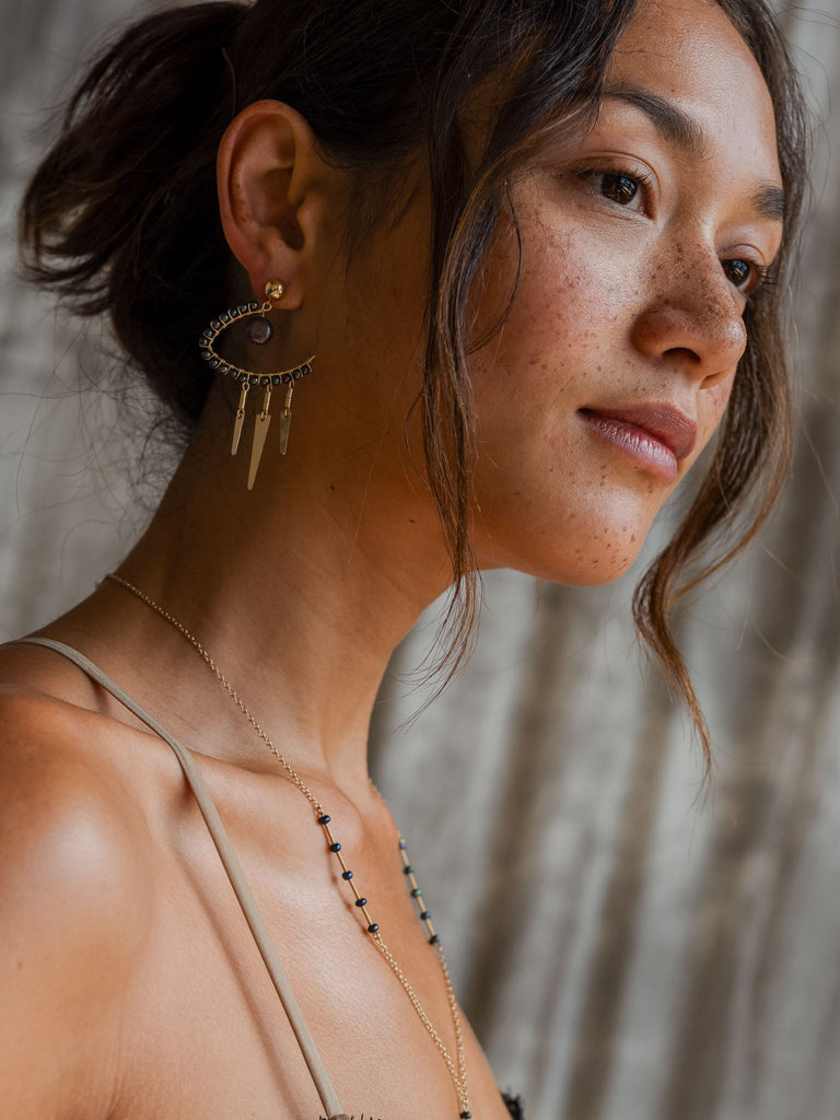 El pendiente Ojo de Ra y Horus es un accesorio único y poderoso que resuena con la energía de estas dos deidades. Dependiendo de qué lado se use, canaliza la energía de Ra u Horus. El arete enmarca la cara con dos formas parecidas a ojos, agregando un conjunto adicional de visión al usuario.
